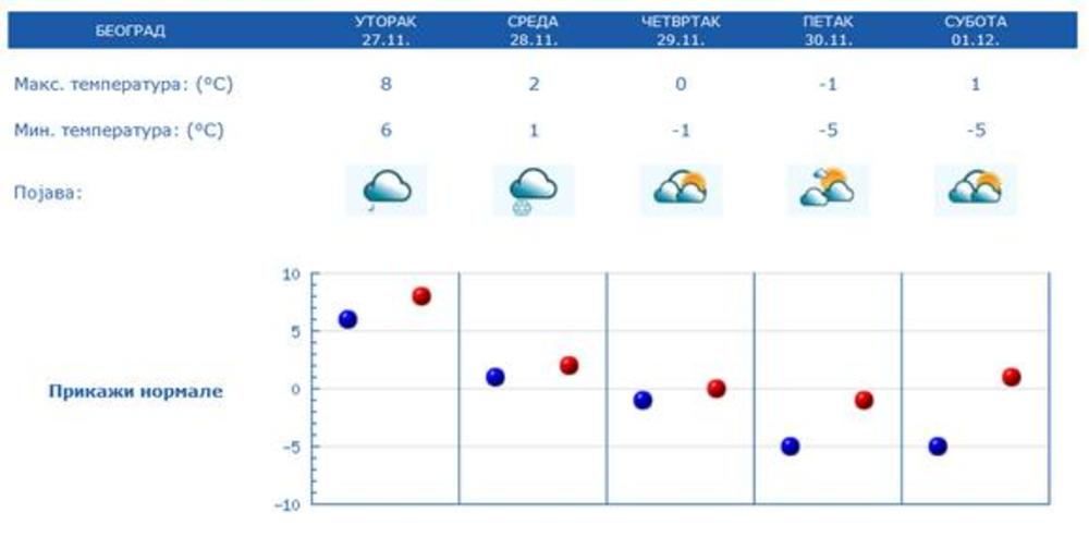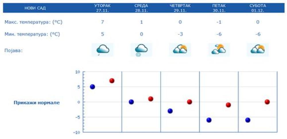 U četvrtak i petak vrlo hladno, uz slab i umeren jutarnji mraz i dnevnom temperaturom oko ili malo iznad nula stepeni i uglavnom suvo, samo je na jugu i jugoistoku moguće provejavanje slabog snega.