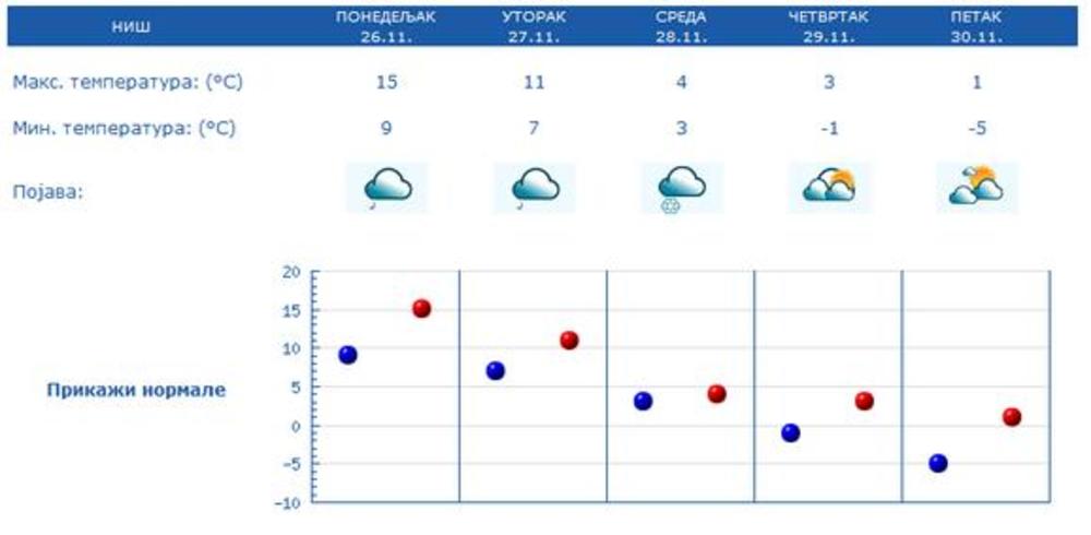Vetar će biti slab i umeren, u Vojvodini i na planinama povremeno jak, severni. Jutarnja temperatura od 4 do 9 stepeni Celzijusovih, najviša dnevna od 6 do 12.