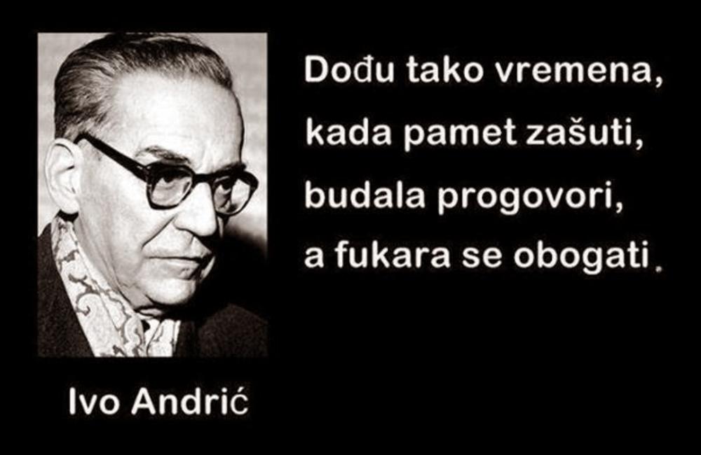 1. Ivo Andrić. Apsolutno neprikosnoven na društvenim mrežama. Citiraju se odlomci iz svih njegovih dela, a posebno iz zbirke "Znakovi pored puta". Zato je zaista teško izabrati one koji su najcitiraniji. Ipak, statistika je i ovog puta presudila. Najpopularnija Andrićeva rečenica je ova: "Dođu, tako vremena kada pamet zaćuti, budala progovori, a fukara se obogati". Verovatno zato što su na ovim prostorima uvek takva vremena.