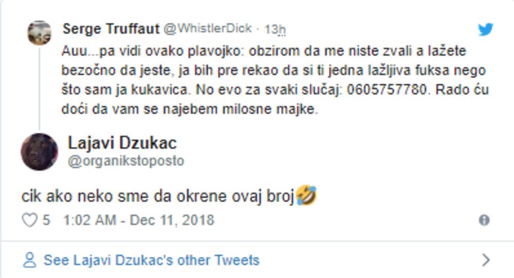 - Auu...pa vidi ovako plavojko: obzirom da me niste zvali a lažete bezočno da jeste, ja bih pre rekao da si ti jedna lažljiva fuksa nego što sam ja kukavica. No evo za svaki slučaj: 0605757780. Rado ću doći da vam se najebem milosne majke.