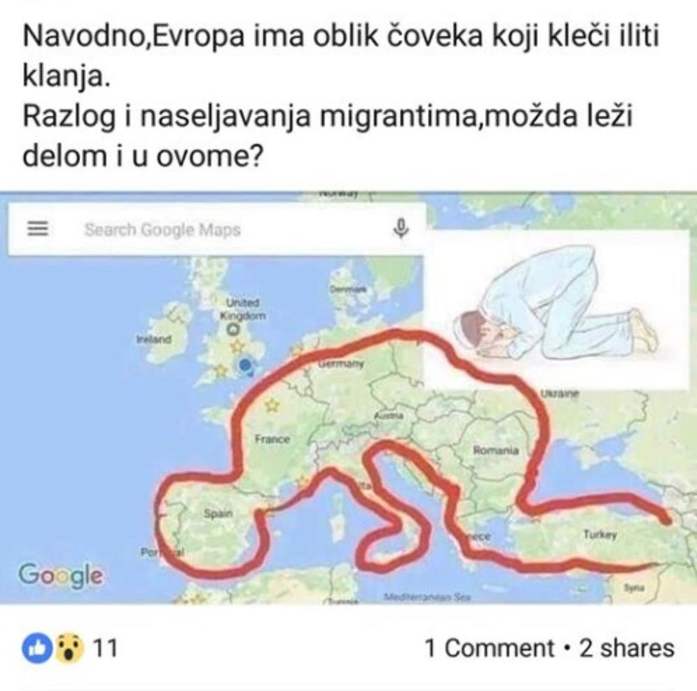 Dosad niko mapu nije posmatrao iz ovog ugla. Kako je napisala jedna korisnica Fejsbuka, Evropa navodno ima oblik čoveka koji kleči ili se klanja.