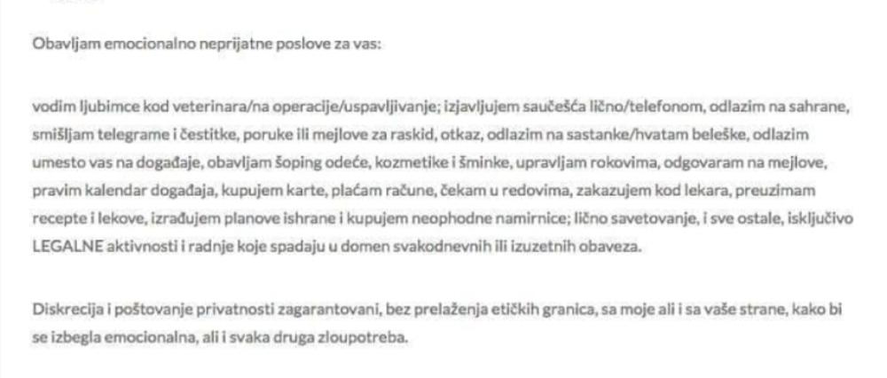 - Vodim ljubimce kod veterinara/na operacije/uspavljivanje; izjavljujem saučešća lično/telefonom, odlazim na sahrane, smišljam telegrame i čestitke, poruke ili mejlove za raskid, otkaz, odlazim na sastanke/hvatam beleške, odlazim umesto vas na događaje, obavljam šoping odeće, kozmetike i šminke, upravljam rokovima, odgovaram na mejlove, pravim kalendar događaja, kupujem karte, plaćam račune, čekam u redovima, zakazujem kod lekara, preuzimam recepte i lekove, izrađujem planove ishrane i kupujem neophodne namirnice; lično savetovanje, i sve ostale, isključivo LEGALNE aktivnosti i radnje koje spadaju u domen svakodnevnih ili izuzetnih obaveza.