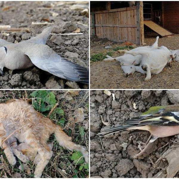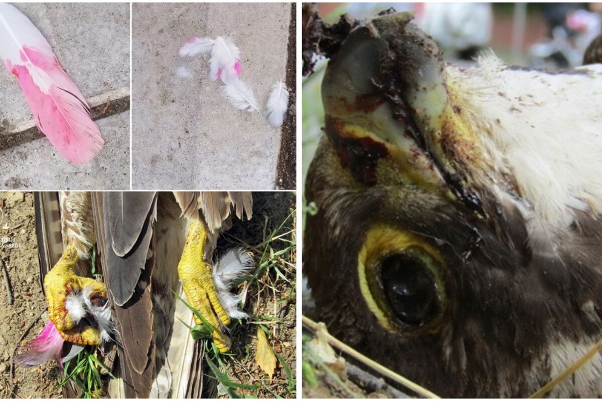 Na gornjim fotografijama je perje iz Vršca, a na donjoj otrovan sivi soko iz centra Novog Sada iz juna 2017. godine. U kandžama se jasno vidi zatrovano perje goluba, a analize referentne laboratorije potvrdile su da je korišćen zabranjeni i izuzetno opasni otrov Furadan.