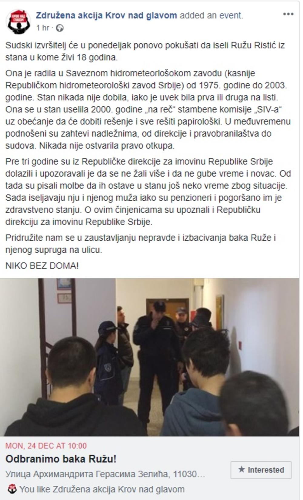 Iz Združene akcije "Krov nad glavom" pozivaju da se spreči nepravda i iseljenje baka Ruže i njenog supruga na ulicu.