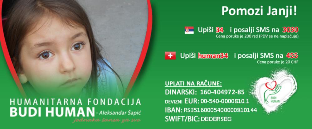 Ukoliko neko nije u mogućnosti da uplati novac, uvek može da pošalje sms na fondaciju Budi human za Janju Stamenković.