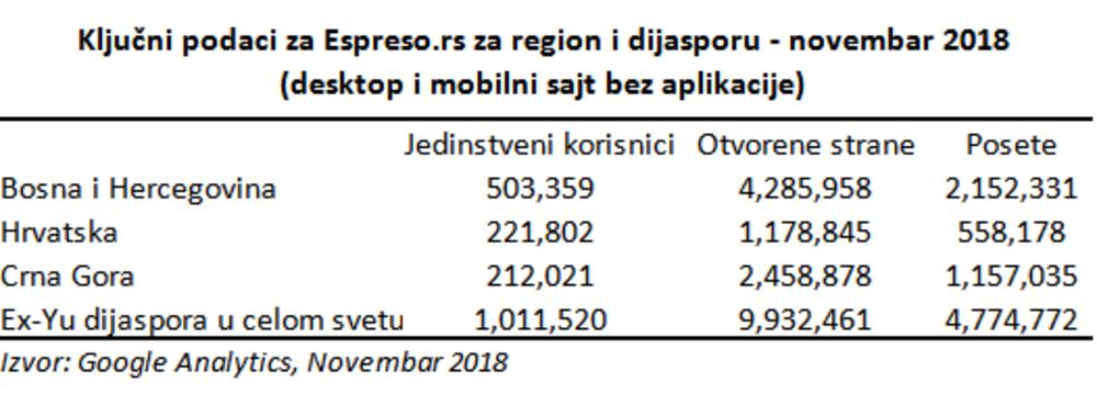 Posle samo tri godine i dva meseca postojanja, ovo je još jedan neverovatan rezultat Espreso.co.rs portala, a trend rasta nastavljen je u Srbiji i u državama bivše SFRJ, odnosno među dijasporom na Zapadu.