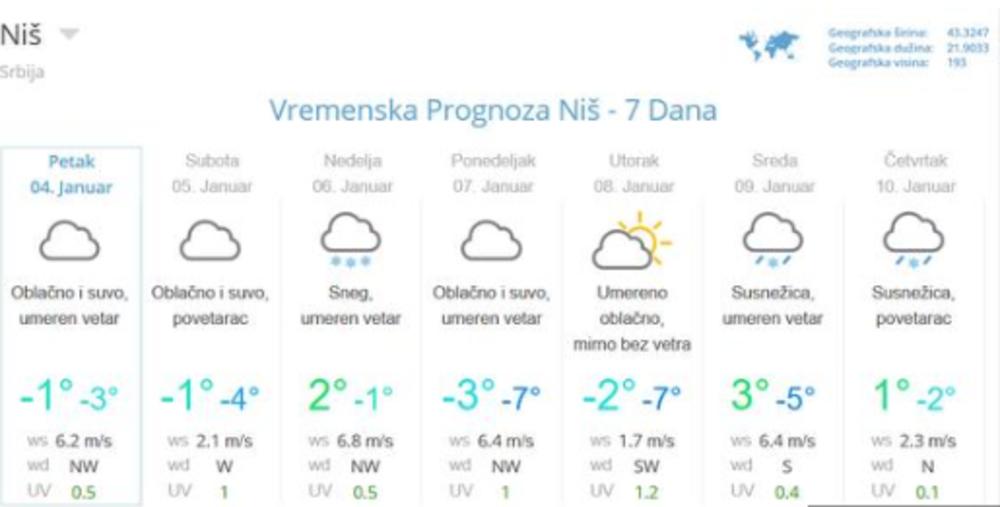 - U prepodnevnim časovima očekuje nas hladno i suvo vreme, dok će se od sredine dana, sa severa zemlje, proširiti jače naoblačenje sa snegom. U toku noći očekuje nas i snežna mećava - naveo je meteorolog Đorđe Đurić.