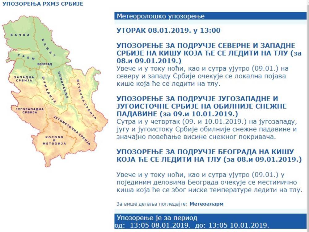 "UPOZORENjE ZA PODRUČJE SEVERNE I ZAPADNE SRBIJE NA KIŠU KOJA ĆE SE LEDITI NA TLU (za 08.i 09.01.2019.)