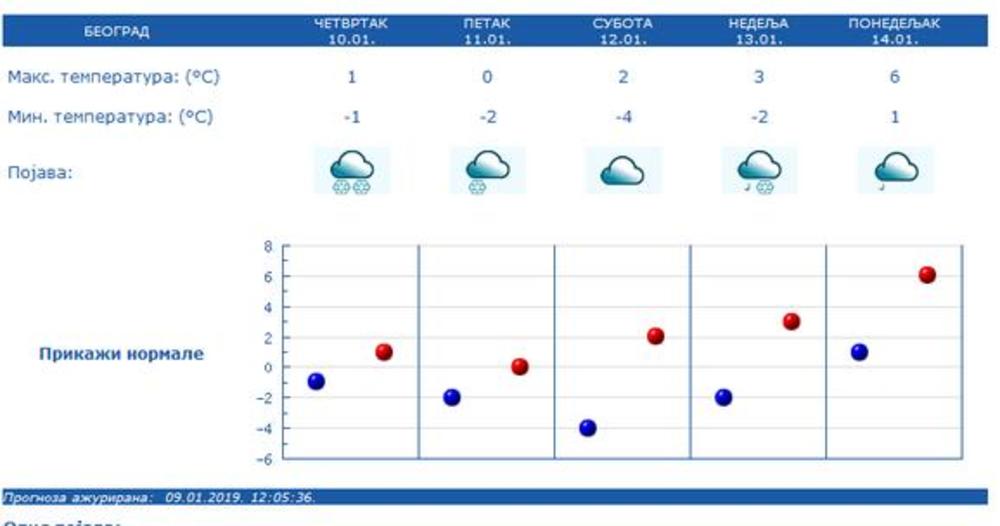 - I u Beogradu oblačno, sa snegom uz osetno povećanje visine snežnog pokrivača. Jutarnja temperatura kretaće se oko -1, a najviša dnevna oko 1. Sve su to normalne temperature za januar - slažu se meteorolozi.