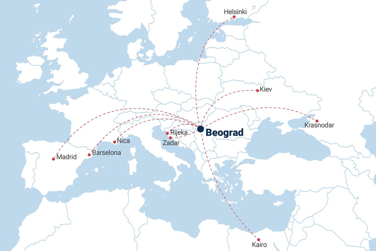 Er Srbija, nacionalna avio-kompanija Republike Srbije, od juna 2019. godine uvešće redovne direktne letove tokom cele godine ka sedam novih destinacija – Kijev, Madrid, Barselonu, Rijeku, Krasnodar, Helsinki i Kairo, kao i dve sezonske linije za Nicu i Zadar.