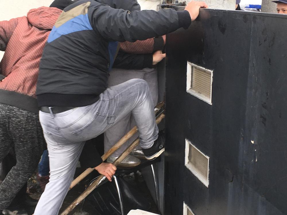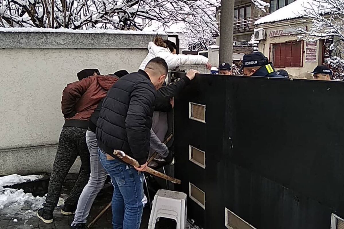Izvršitelji sve vreme pokušavaju da provale u dvorište, dok ukućani sa druge strane drže ogradu.