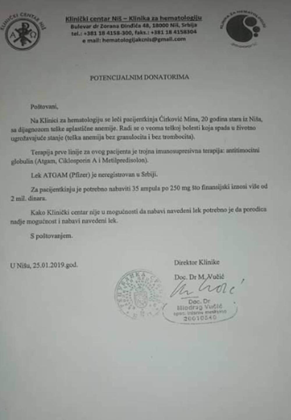 Za lečenje joj je neophodo 35 ampula po 250mg leka ATGAM (PFIZER)