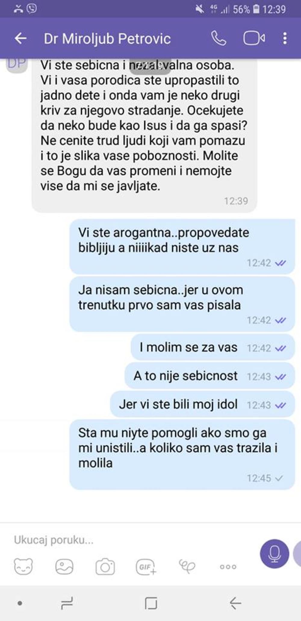 - Ne. On meni nikada nije rekao da njegova terapija ne deluje, nego je uvek postojalo objašnjenje zašto je to tako. Kao kada je rekao da ga napadaju demoni. Pred kraj, u novembru mesecu rekao mi je da, kada bi moj brat bio godinu dana u njegovom centru, on nikada više ne bi imao epileptične napade. Stalno smo radili na sebi. Mislil smo da je greška do nas i da radimo nešto pogrešno, a nismo znali šta. Nismo imali ni kome da se obratio, zato što je doktor Petrović mene na kraju blokirao na mejlu. Rekao mi da mu ne dosađujem, jer će me blokirati i to je i uradio. To je bilo pre smrti mog brata, 30. novembra.