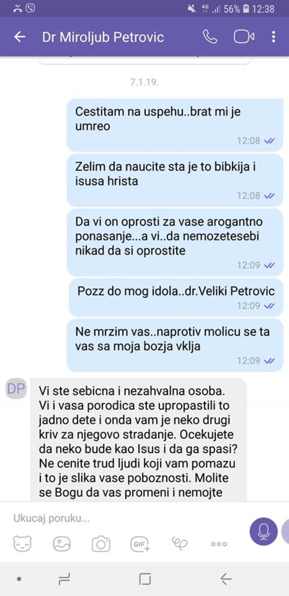 - Moj brat je preminuo posle napada epilepsije, za koje je gospodin Petrović tvrdio da su demoni. Kada sam to saznala, jako teško sam primila. Nakon sat vremena sam pozvala doktora Petrovića, ali on se nije javio. Zatim sam mu poslala poruku i napisala, "doktore Petrović, ja Vam čestitam na uspehu, moj brat je preminuo". Napisala sam mu i da nikad nije bio uz nas i zamolila sam ga da pročita Sveto pismo i Bibliju i da nauči ko je bio Isus Hrist. Isus je pomagao ljudima i bio sa njima u njihovoj boli. Na to mi je gospodin Petrović odgovorio da smo moja porodica i ja upropastili to jadno dete, da ne cenimo trud ljudi koji nam pomažu i da poradim na svojoj pobožnosti.
