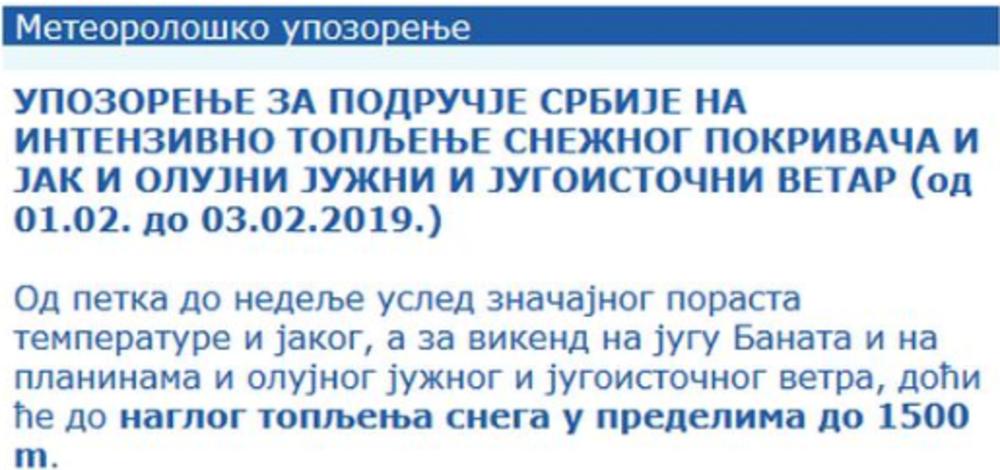 Kod nas će tako doći do izntenziovnog topljena snega, ali je pred nama i period jakog i olujnog vetra, koji se očekuju od petka, 1. februara, pa do nedelje 3. februara, upozorava Republički hidrometeorološki zavod (RHMZ).