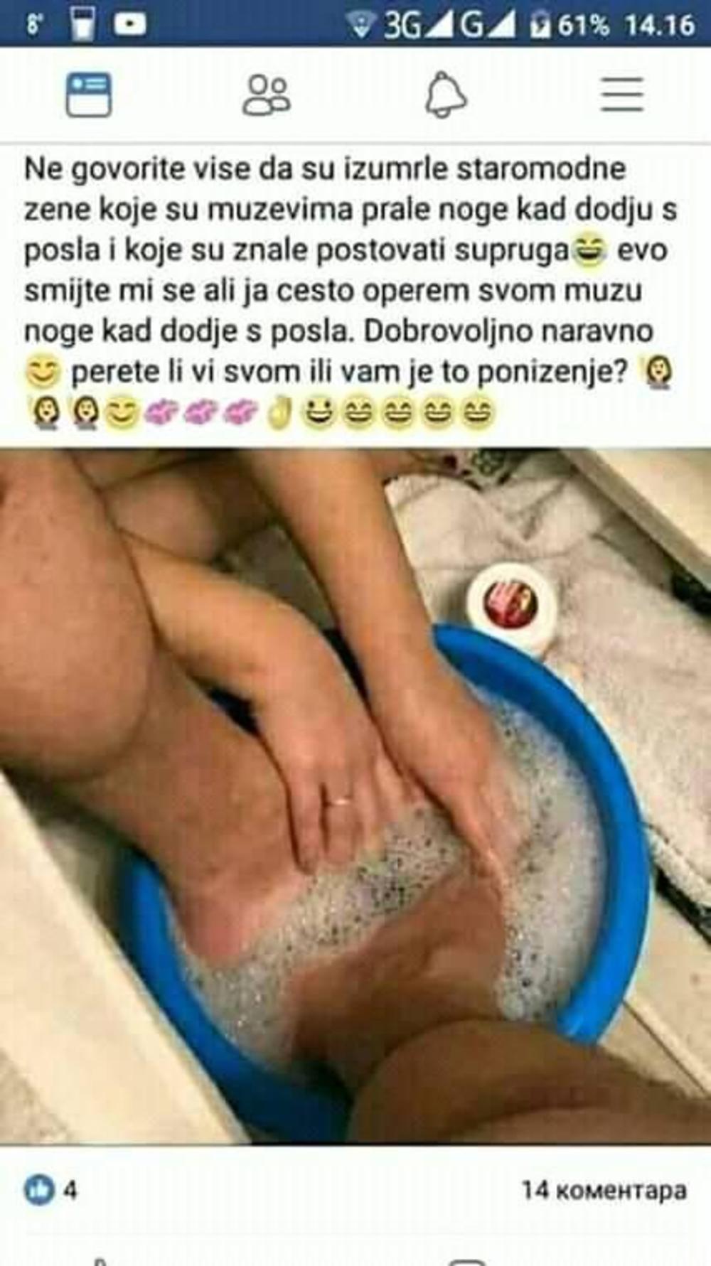 - Ne govorite više da su izumrle stramodne žene koje su muževima prale noge kad dođu sposla i koje su znale poštovati supruga. Evo smejte mi se, ali ja često znam da svom mužu operem noge kad dođe s posla, dobrovoljno naravno. Perete li vi svom mužu noge ili vam je to poniženje? - napisla je jedna pored fotografije koju je objavila na Fejsbuku.
