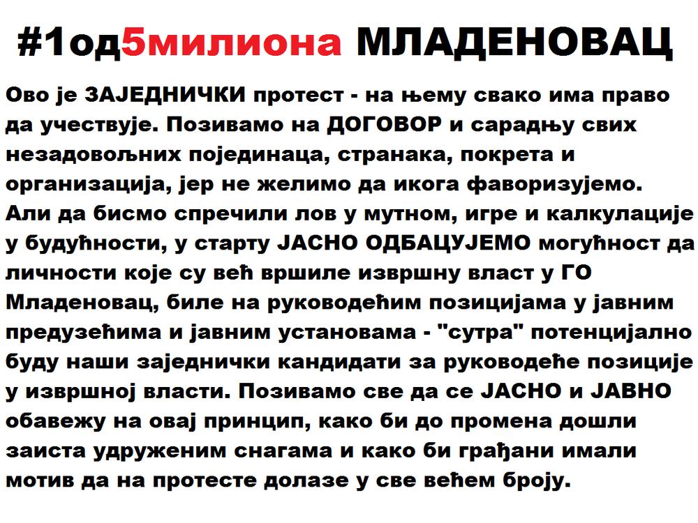 Ovim obraćanjem javnosti želimo da se odredimo prema stvarima i idejama u budućnosti, sačuvamo i razvijemo energiju koju su protesti doneli - a tako će biti samo i jedino ako su stvari kristalno jasne. Nakon dva sastanka otvorenog parlamenta građana Mladenovca, na koji su bili pozvani svi nezadovoljni građani i organizacije, odlučeno je o detaljima jedinstvenog protesta i organizacionom odboru iz reda građana. Obavezali smo se na to da pravimo ZAJEDNIČKI protest na koji su dobrodošli svi koji smatraju da oni koji trenutno drže poluge vlasti i moći treba da odu - i u tome smo složni. Ali ne želimo da stvaramo prostor i budemo paravan za bilo čije partikularne ambicije i interese, niti da se protest izvrgne u bilo čiji miting - stoga na sve nezadovoljne građane, saveze, stranke, pokrete i organizacije gledamo jednako i nudimo im da doprinesu našoj zajedničkoj borbi. A neophodno je da nastavimo ZAJEDNO i da na sastancima Otvorenog parlamenta građana, lokalnom poligonu neposredne demokratije, u kome svako ima pravo na javan i jasan stav, argumentovan predlog i ideju - nastavimo konstruktivnu saradnju u potrazi za najboljim rešenjima za našu zajednicu. Odbacivanjem i zanemarivanjem saradnje i zajedničke borbe SVIH nezadovoljnih pojedinaca i organizacija - nastavilo bi se tvrdoglavo opoziciono statiranje koje traje godinama, a vladajuća garnitura biće sigurna na svojim mestima još dugo. Pretpostavljamo da to niko racionalan i dobronameran ne želi - zbog toga tražimo precizno određivanje pojedinaca i organizacija u nameri da široj javnosti stvari budu u potpunosti razumljive. Kako bismo sprečili igre i kalkulacije u budućnosti, u startu JASNO ODBACUJEMO mogućnost da ličnosti koje su već obavljale izvršnu vlast u GO Mladenovac, bile na rukovodećim pozicijama u javnim preduzećima i javnim ustanovama - "sutra" potencijalno budu naši zajednički kandidati za rukovodeće pozicije u izvršnoj vlasti. Poštujemo svaki opozicioni stav i želju da se doprinese promena ove i ovakve vlasti i pozivamo SVE na Otvoreni parlament građana, kao i na proteste, ali ukoliko ne želimo da SNS korišćenjem spin mehanizama vlada godinama - dogovor oko ključnih stvari, logično i nesebično odstupanje su NEOPHODNI.