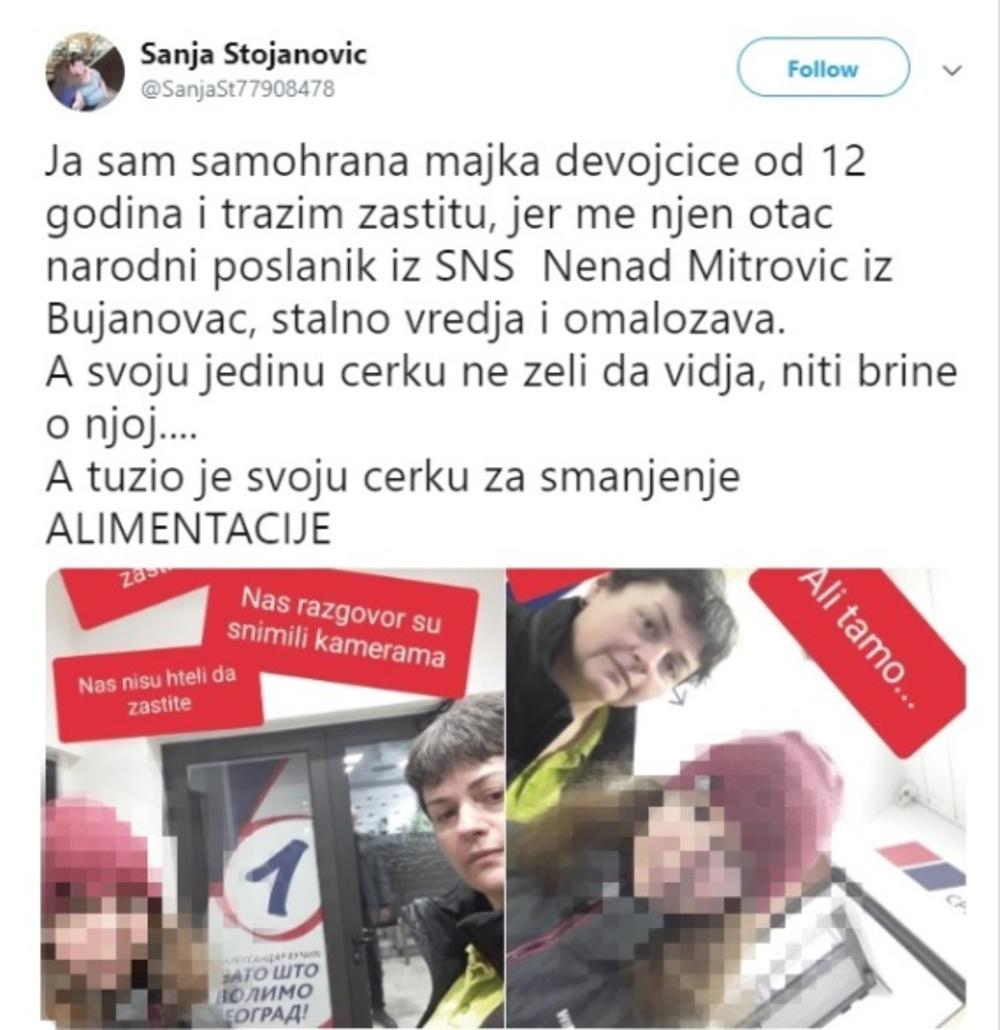 - Ja sam samohrana majka devojčice od 12 godina i trazim zaštitu, jer me njen otac narodni poslanik iz SNS, Nenad Mitrovic iz Bujanovac, stalno vređa i omaložava. A svoju jedinu ćerku ne zeli da viđa, niti brine o njoj....