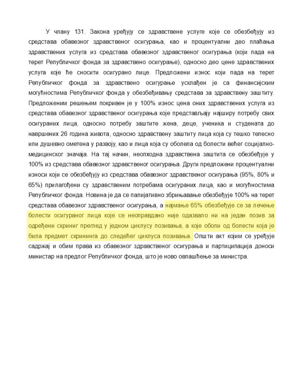 - Najmanje 65 odsto izdvaja se iz sredstava obaveznog zdravstvenog osiguranja za lečenje bolesti čije je rano otkrivanje predmet ciljanog preventivnog pregleda, odnosno skrininga ukoliko se osigurano lice nije odazvalo ni na jedan poziv u okviru jednog ciklusa pozivanja, niti je svoj izostanak opravdalo, a ta bolest je dijagnostikovana u periodu do narednog ciklusa pozivanja - navedeno je u predlogu zakona.