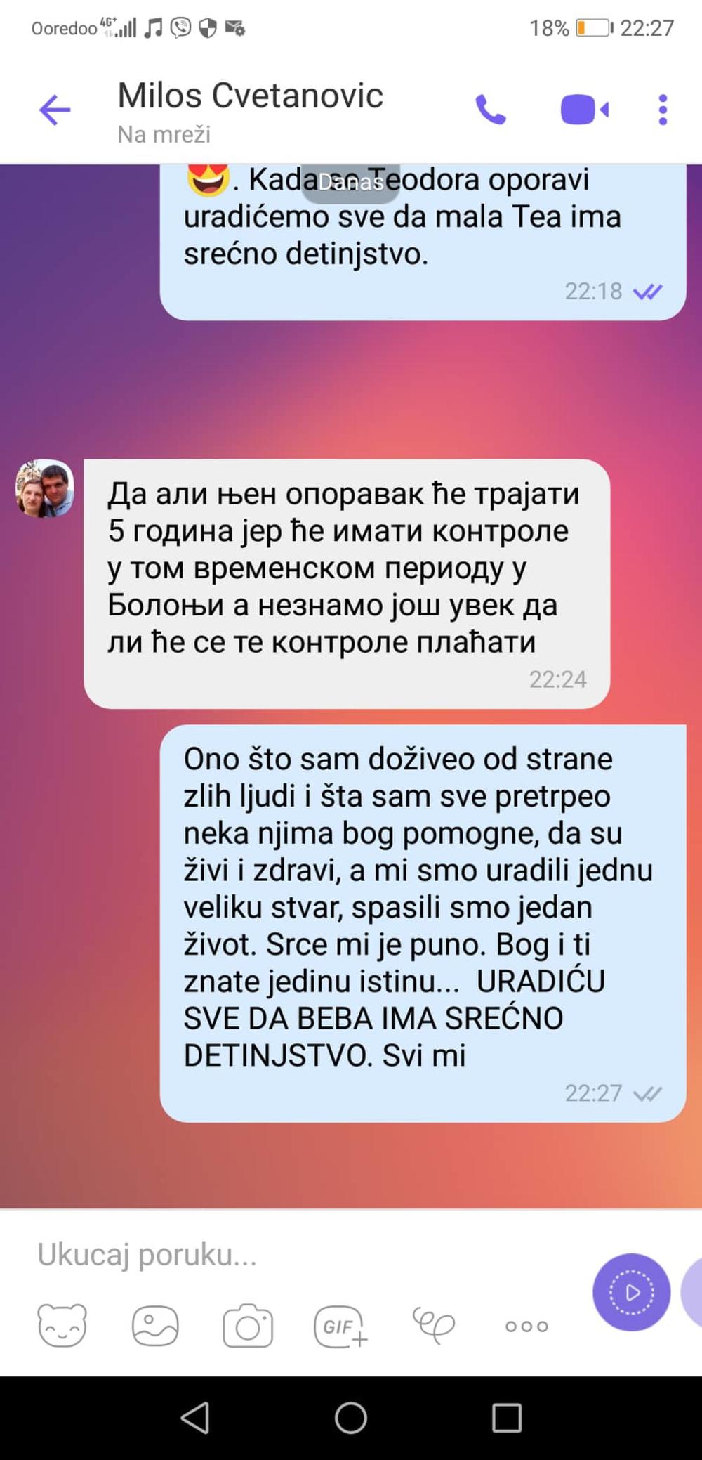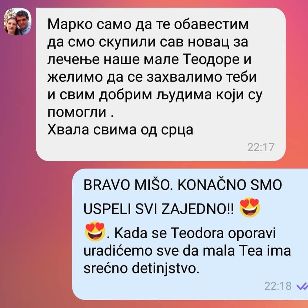 - Ne zanimaju me tuđa mišljenja jer su nebitna, bitno je da onaj gore vidi sve. Srećan sam što smo na kraju svi ostali živi i zdravi. Svi ti koji su govorili da je nemoguće neka prvo ustanu iz kreveta i neka pretrče do prodavnice pa onda neka pričaju. Na Balkanu je sve nemoguće ljudima, sve im je čudno, sve im smeta, a nikada prstom mrdnuli da nešto dobro urade od svog života Srce mi je puno jer nam je Teodorin otac javio da smo uspeli. Teodora je uspešno operisana i čeka je dug oporavak... Sakupili smo oko 90.000evra možda i više, objašnjava Marko.