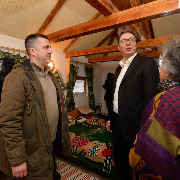 Predsednik je obišao jednu od brvnara, nakon čega je u sali za ručavanje, koja se nalazi u sklopu etno sela, sa meštanima razgovarao o ulaganjima u etno turizam.