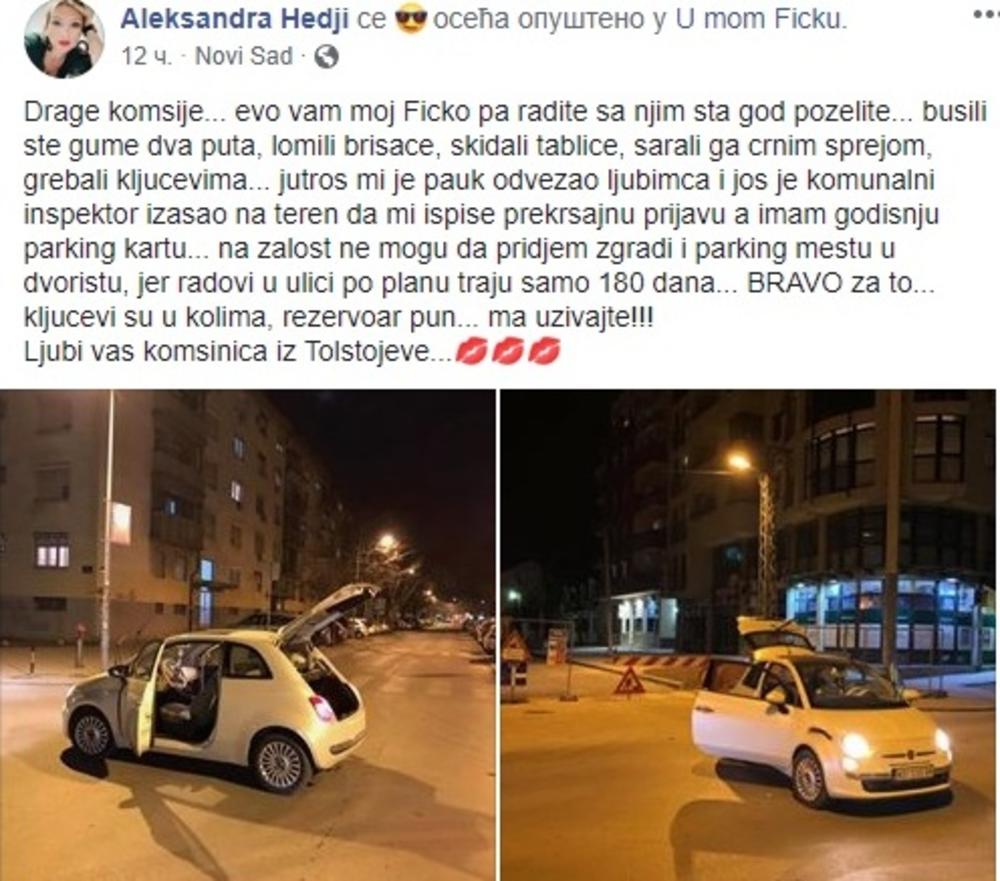 "Drage komšije, evo vam moj Fićko pa radite sa njim šta god poželite", napisala je Aleksandra u poruci koju je objavila na Fejsbuku.