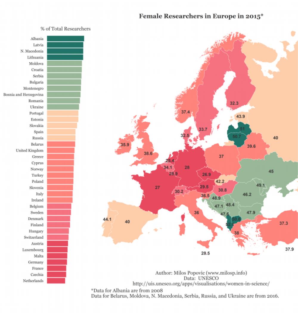 Kada se pogleda mapa, zanimljivo je videti kako balkanske zemlje izuzetno poštuju žene u nauci, a Srbija ih, prema istraživanju, ima nešto preko 47 odsto.