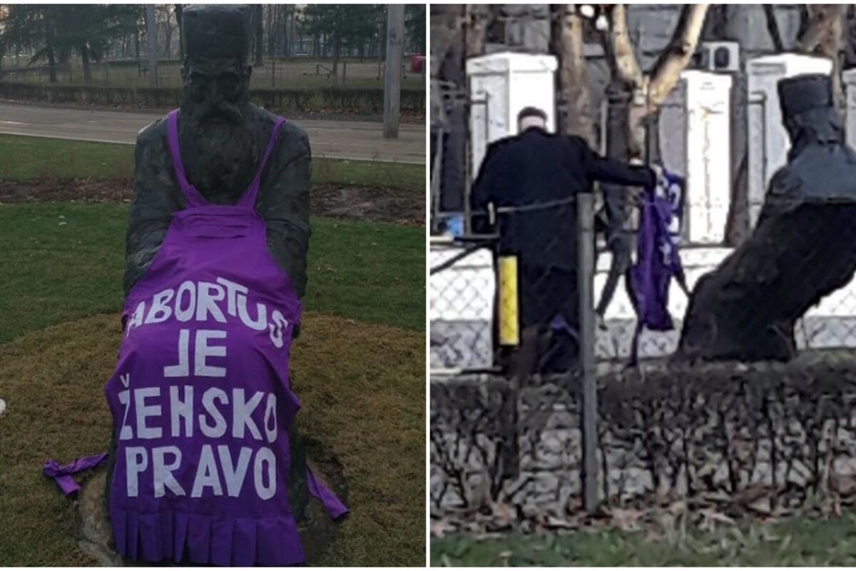 Statua patrijarha Pavla na Tašmajdanu na kratko je bila ukrašena, a ko je sveštenik koji je kecelju s natpisom "abortus je žensko pravo" skinuo?