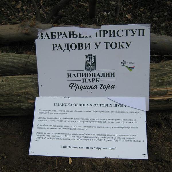 Na obaveštenju Nacionalnog parka istaknutog na jednom stablu, piše da je u toku planska obnova hrastovih šuma.