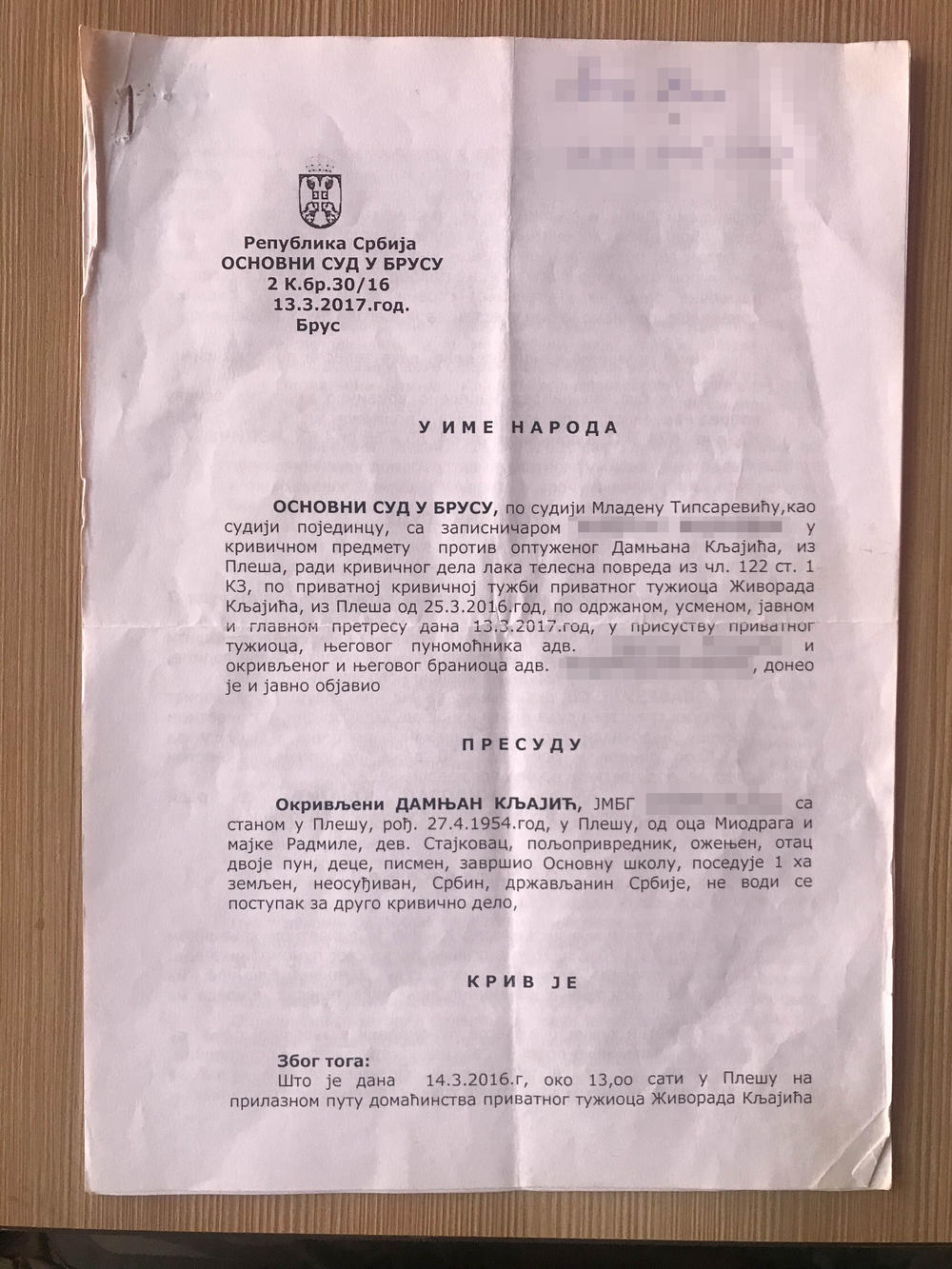 - Živorad Klajjić me je tužio da sam ga udario. Ja sam imao svedoke da to nisam uradio. Sve se zbilo 14. marta 2016. godine u Plešu, a suđeno je u Brusu. Međutim, Živoradova unuka je u to vreme bila pripravnica u sudu u Brusu. Malo nakon toga dobila je posao kod Jutke. Ono što mi znamo, jeste da je ona zapravo došla na mesto Marije Lukić - objašnjava naš sagovornik i dodaje da usled svega što se u Brusu dešava godinama unazad i rodbinkih veza koje su, kako kaže, iznad zakona, smatra da je čitav proces namešten. .