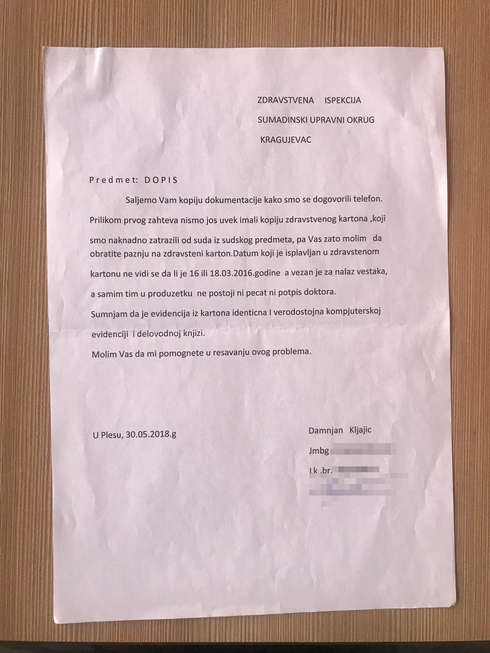 Damnjan dalje navodi da se on obratio Domu zdravlja u Vrnjačkoj banji u vezi tog navodnog pregleda, kao i datuma koji je prepravljan, ali da odgovor od njih nije dobio.