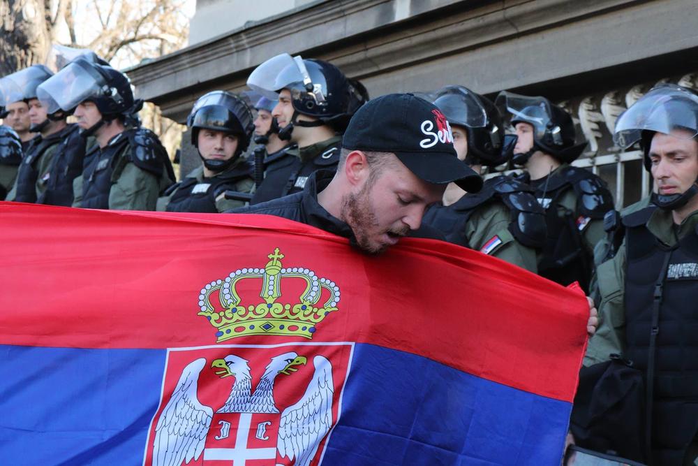 Lider Dveri Boško Obradović pozvao je okupljene da blokiraju sve izlaze iz zgrade Predsedništva Srbije i da se ne razilaze dok predsednik Aleksandar Vučić ne da ostavku.