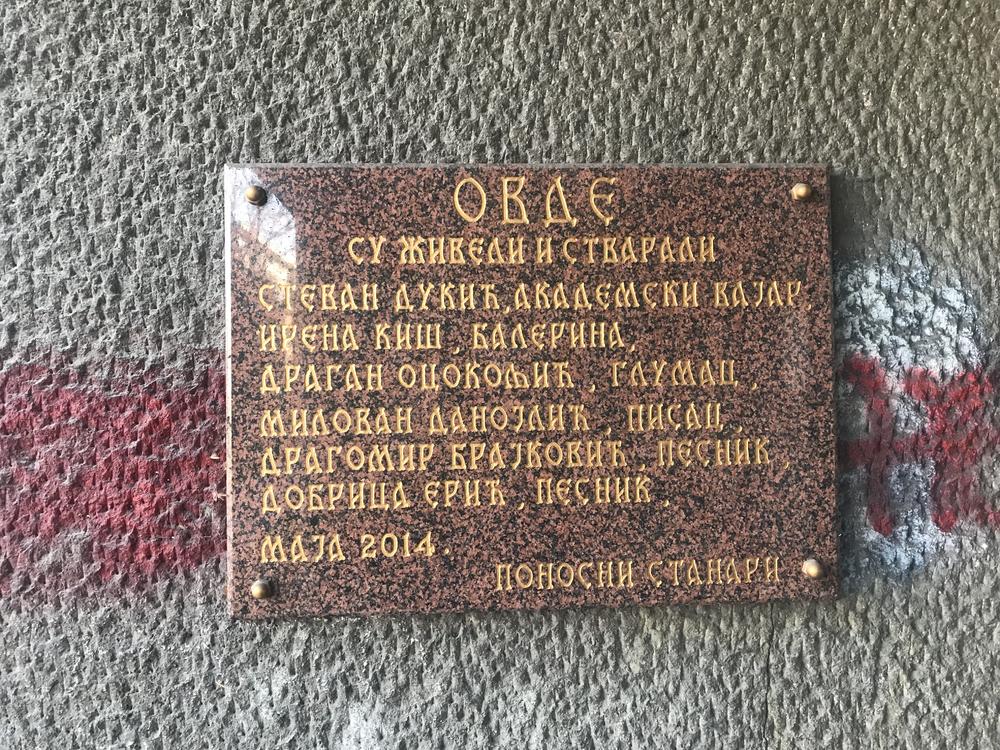 Na samom ulazu zapazili smo mermernu tablu sa imenima poznatih pisaca, glumaca, vajara, koji su ponosni stanari o svom trošku okačili i na taj način odali počast umetnicima koji su tu živeli i stvarali. Među imenima nalazi se i ime čuvenog pesnika Dobrice Erića.
