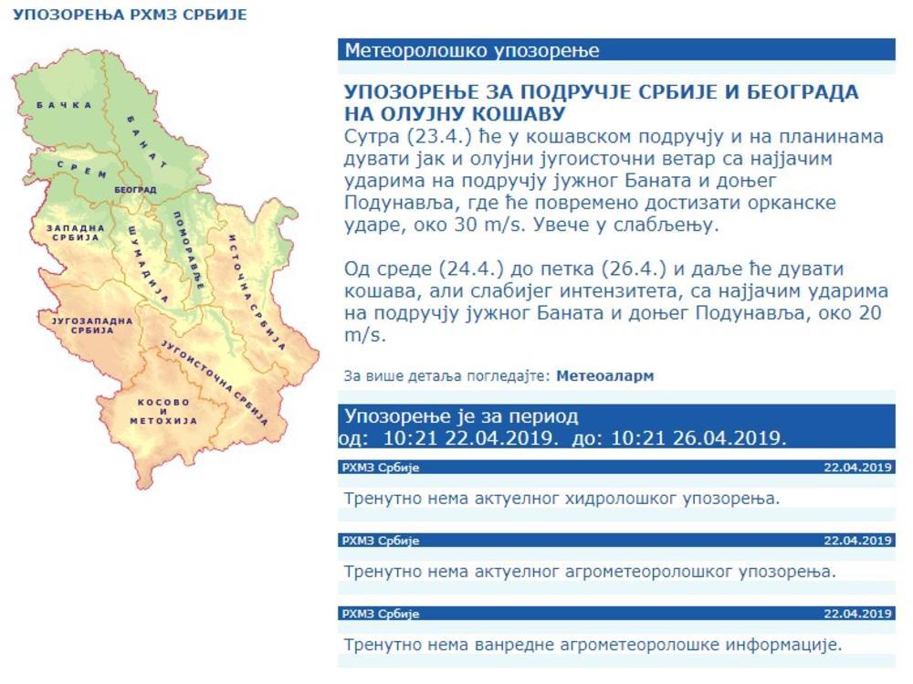 Od srede do petka (25.04.) i dalje će duvati košava ali slabijeg intenziteta, sa najjačim udarima na podrčju južnog Banata i donjeg Podunavlja, oko 20 m/s, navodi se u saopštenju.