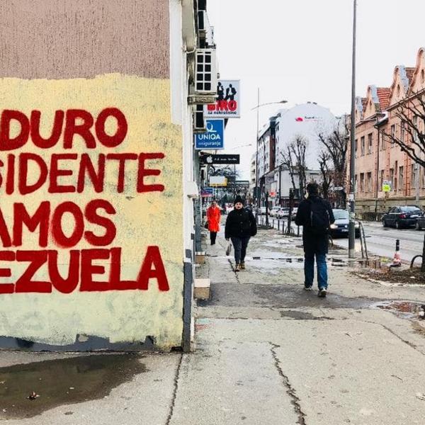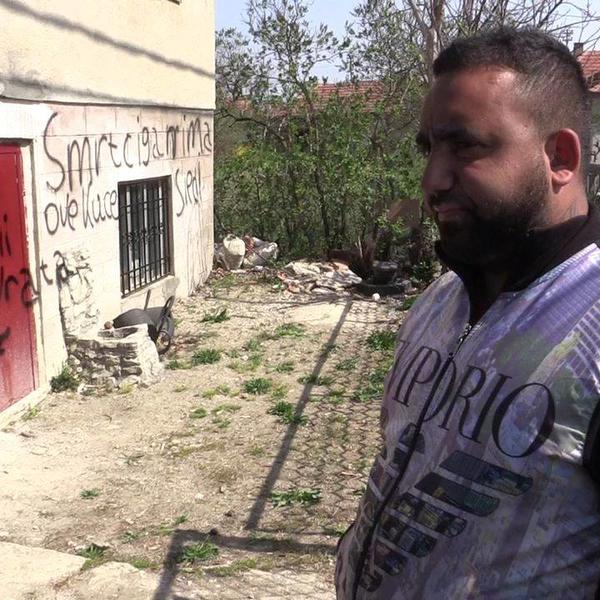 Sa donje strane zgrade, na tablama i oglasnoj tabli ispisano je "Marš iz moje ulice" i "fašisti".