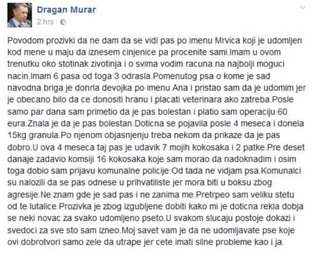 On je tada napisao da je Mrvica bila bolesna, da je platio operaciju 60 evra, da devojka po imenu Ana koja mu je dovela Mrvicu, znala da je ona bolesna, i da devojka psa traži zbog novca koji dobija za udomljavanje.