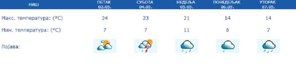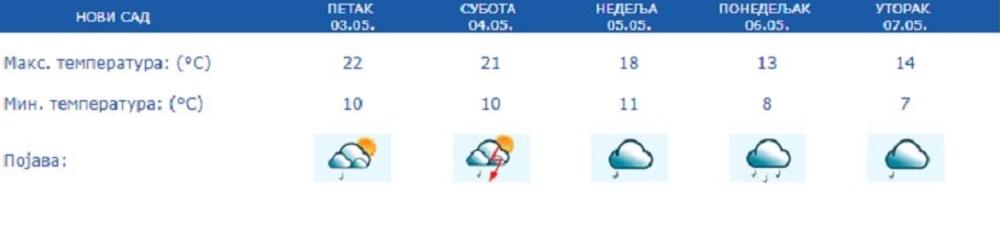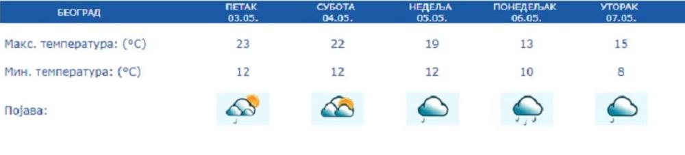 Jutarnja temperatura od pet do 12 stepeni, najviša dnevna od 20 do 25. U Beogradu ujutro i pre podne sunčano, posle podne prolazno umereno naoblačenje, u pojedinim delovima grada moguća kratkotrajna kiša ili pljusak s grmljavinom.