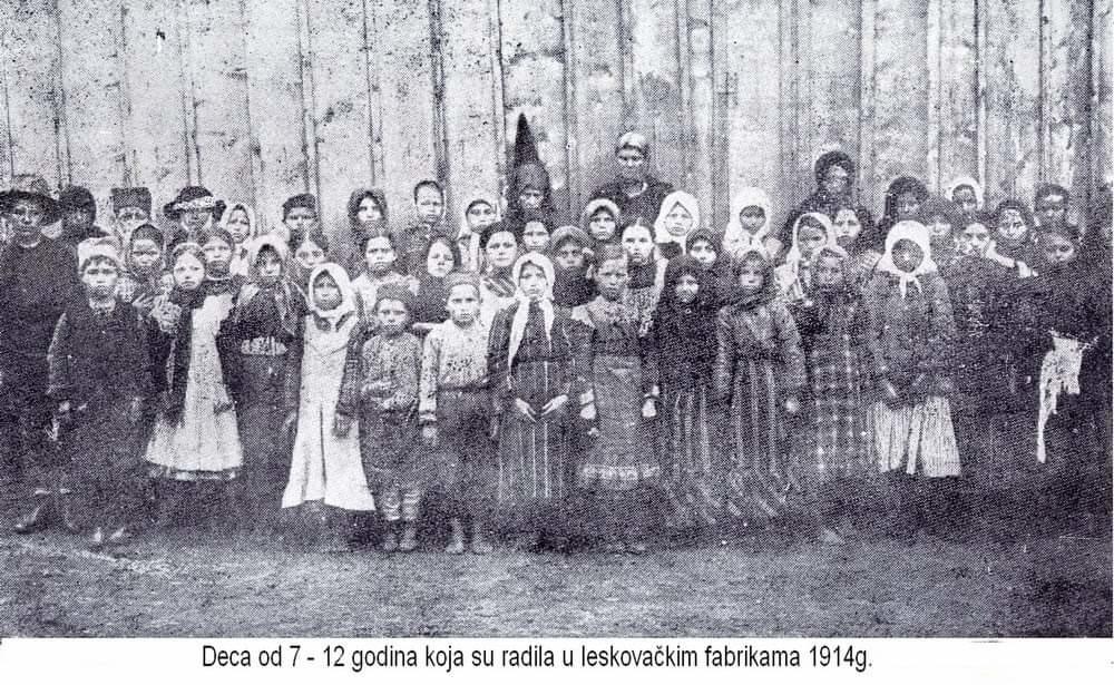 "Deca iz tekstilnih fabrika u Leskovcu. Od četrdeset sedmoro, šestoro ih je stupilo u fabriku od sedam godina, četrnaestoro od osam, dvanaestoro od devet, osmoro od deset, sedmoro od jedanaest. Rade u fabrici po 12 sati. Njihova starost je: četvoro od osam, petoro od devet, sedmoro od deset, desetoro od jedanest, šesnaestoro od dvanaest, petoro od trinaest, jedno od četrnaest godina" , piše.