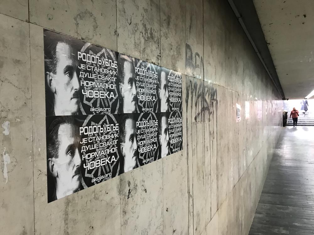 U centru Beograda, u podzemnom prolazu ispod Spomenika obešenima na Terazijama 17. avgusta 1941. godine, jutros su se pojavili plakati sa likom Dimitrija Ljotića i njegovim citatom o rodoljublju.