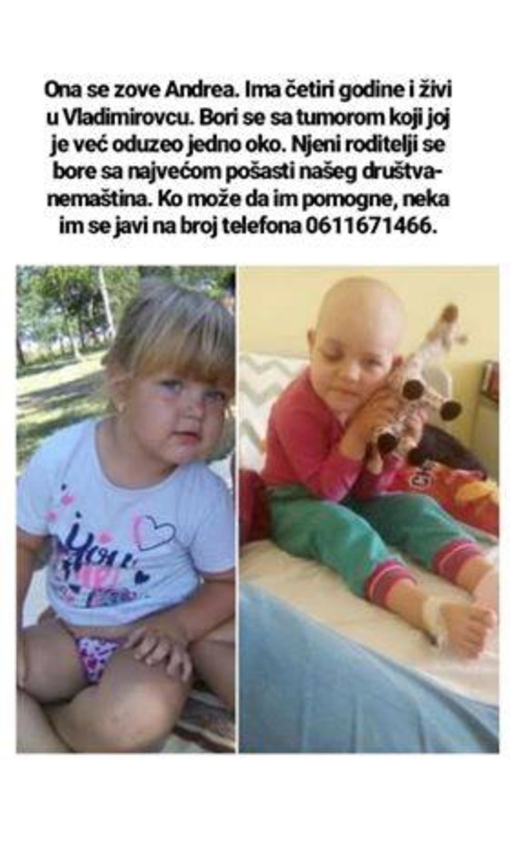 - Andrea ima šest hemoterapija, nakon kojih mora da ide na zračenje. Onda će da se radi snimak da se vidi da li se to povuklo ili nije. U pitanju je tumor oka, izvađeno joj je oko, a onda su utvdili da joj je zahvaćen i očni živac, ceo centimetar, zbog toga mora da ide na terapije i zračenje, a nadamo se da će se tumor nakon toga povući. Otkad je počela sa terapijama nema apetit i jedva da nešto pojede. Takođe je izgubila i kosu... Teško je, stvarno sve to - ispričao nam je Andrein otac Marin.
