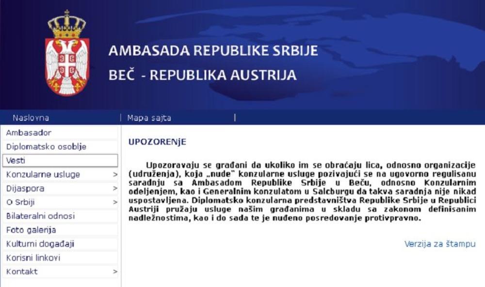 - Upozoravaju se građani da ukoliko im se obraćaju lica, odnosno organizacije (udruženja), koja „nude“ konzularne usluge pozivajući se na ugovorno regulisanu saradnju sa Ambasadom Republike Srbije u Beču, odnosno Konzularnim odeljenjem, kao i Generalnim konzulatom u Salcburgu, da takva saradnja nije nikad uspostavljena - navodi se na sajtu ambasade Srbije u Beču.