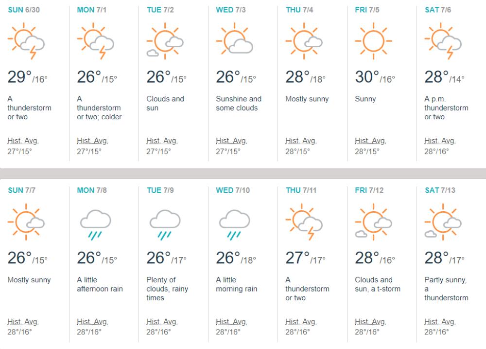 Preovlađivaće promenljivo oblačno vreme, ali sa znatno manje padavina nego maj. Biće sparno i nestabilno, uz povremene pljuskove i grmljavinu. Zapravo, ovakve vremenske prilike i jesu nešto što se može očekivati u to doba godine.