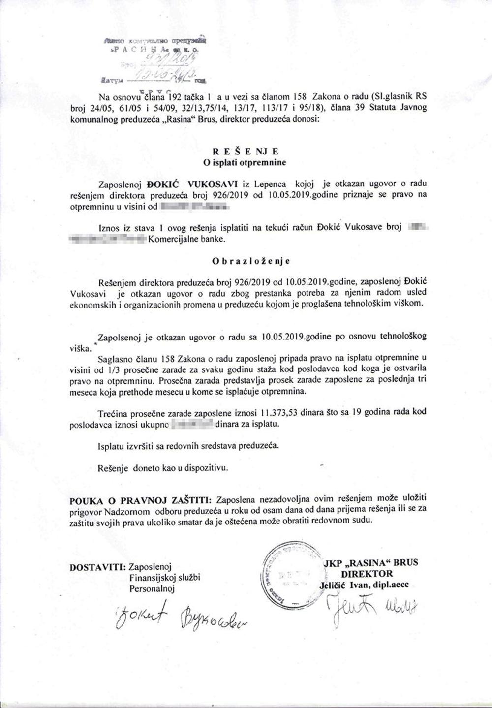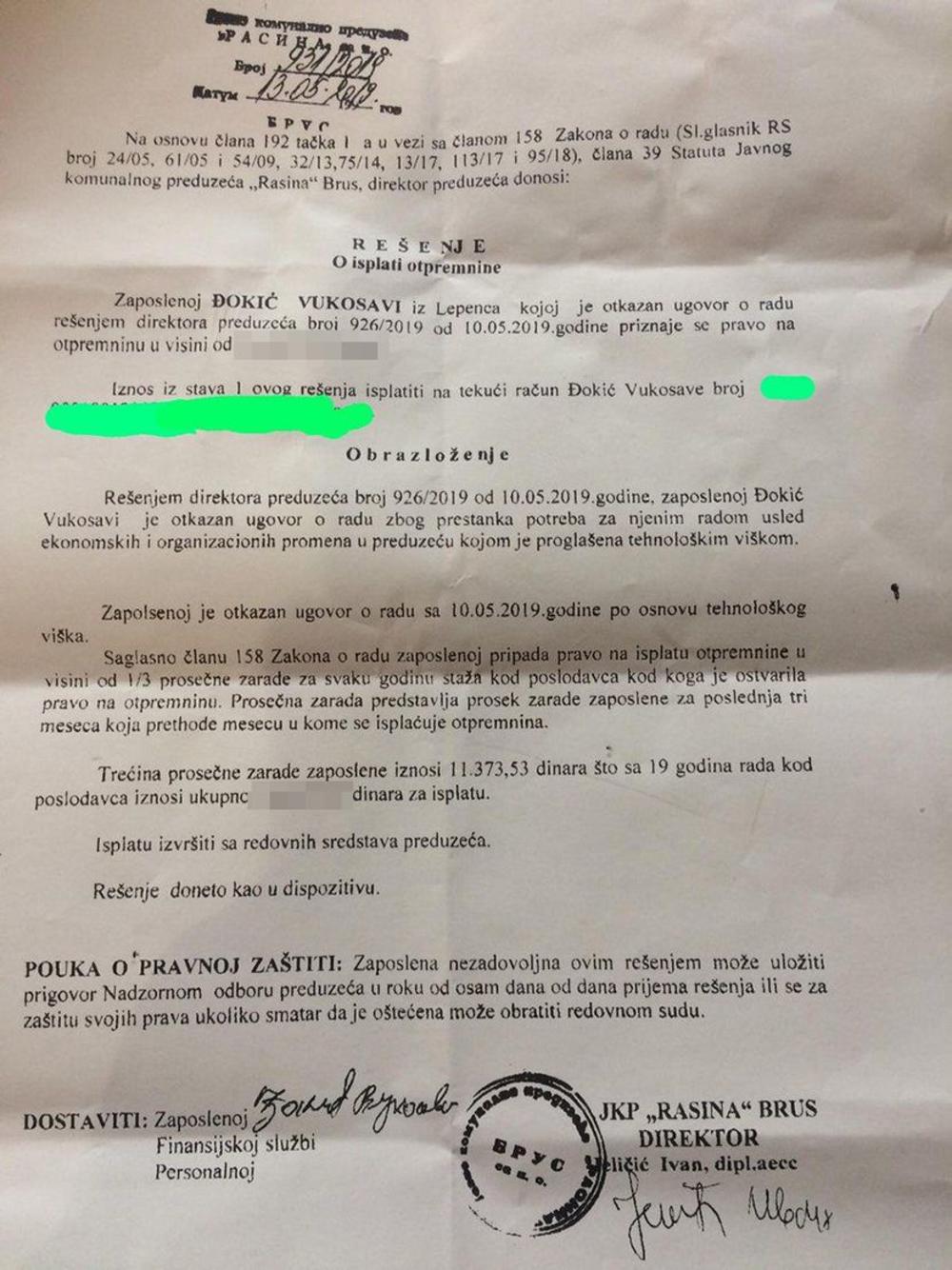 Ona je objavila rešenje JKP "Rasina", na čijem je čelu Jutkin bratanac Ivan Jeličić, a u kojem se navodi da se Vukosavi Đokić otkazuje ugovor o radu