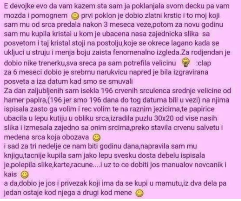 Međutim, jedna devojka je na ana.rs forumu podelila savet šta je ona svom dečku poklonila i time želela da olakša ostalim devojkama prilikom odabira poklona.