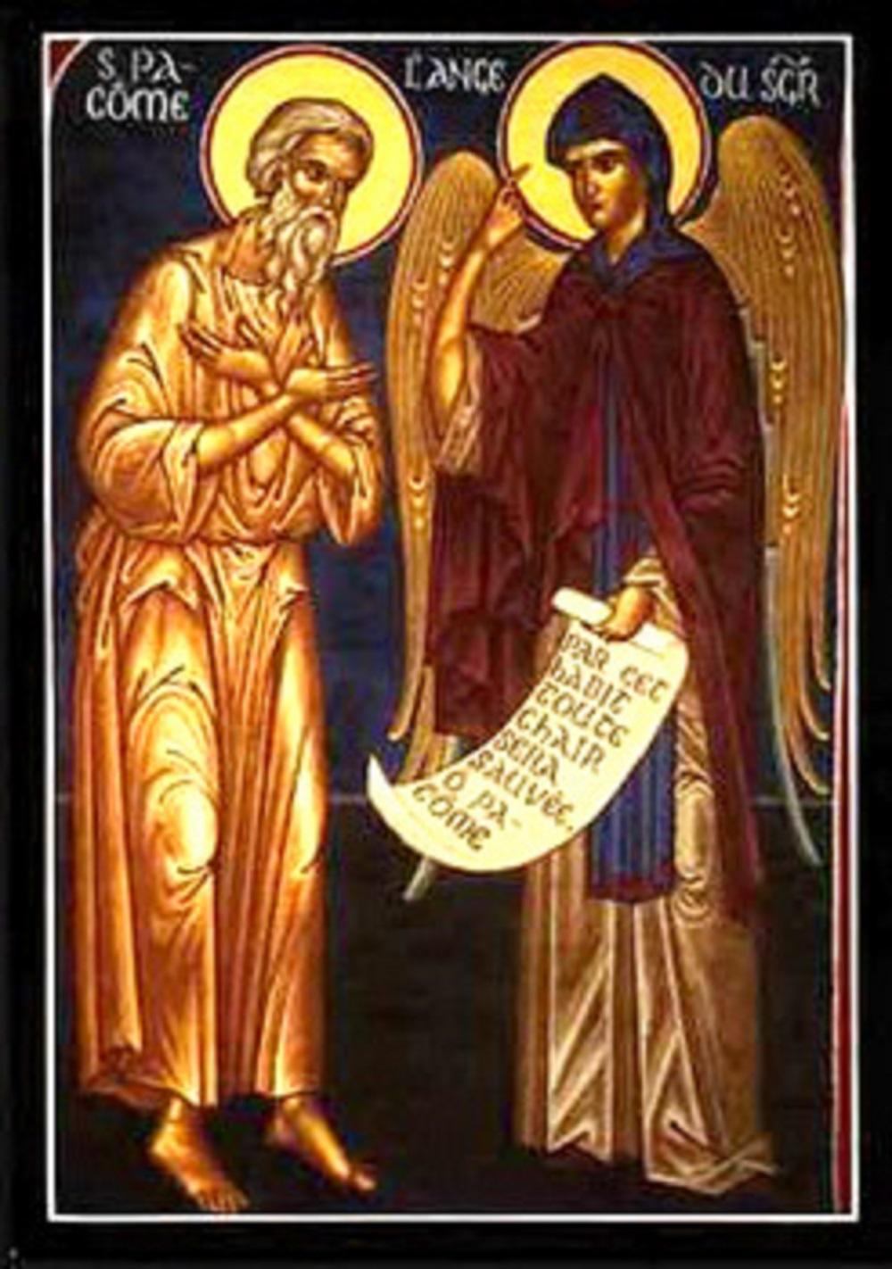 Tada mu se javi angel u odelu shimnika na mestu zvanom Tavenisiot, i dade mu daščicu, na kojoj beše napisan ustav opštežitelnog manastira, naredivši mu da takav manastir ustroji na tom mestu, proričući mu da će se u tom manastiru steći mnogi inoci radi spasenja duša.