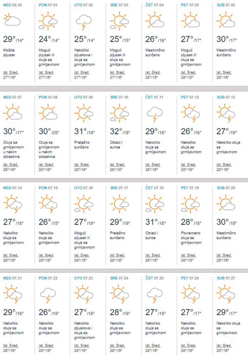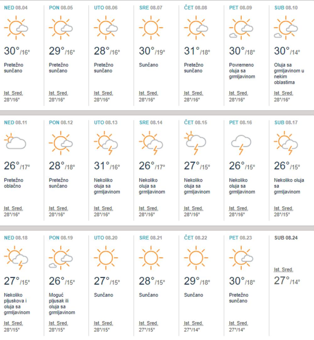 Prema izgledima za naredne dane, do srede promenljivo oblačno, toplo i sparno, mestimično kratkotrajna kiša, pljuskovi i grmljavina. U četvrtak i petak oblačno i hladnije, mestimično kiša. Zatim malo toplije i dalje promenljivo.