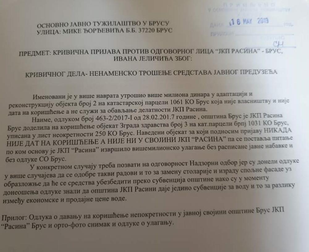 Navodi se da je navedeni objekat za koji je podneta prijava nikada nije dat na korišćenje, a nije ni u svojini JKP "Rasina", te se postavlja pitanje, po kom osnovu je JKP "Rasina" izvršilo višemilionsko ulaganje bez raspisivanja javne nabavke i bez odluke SO Brus?