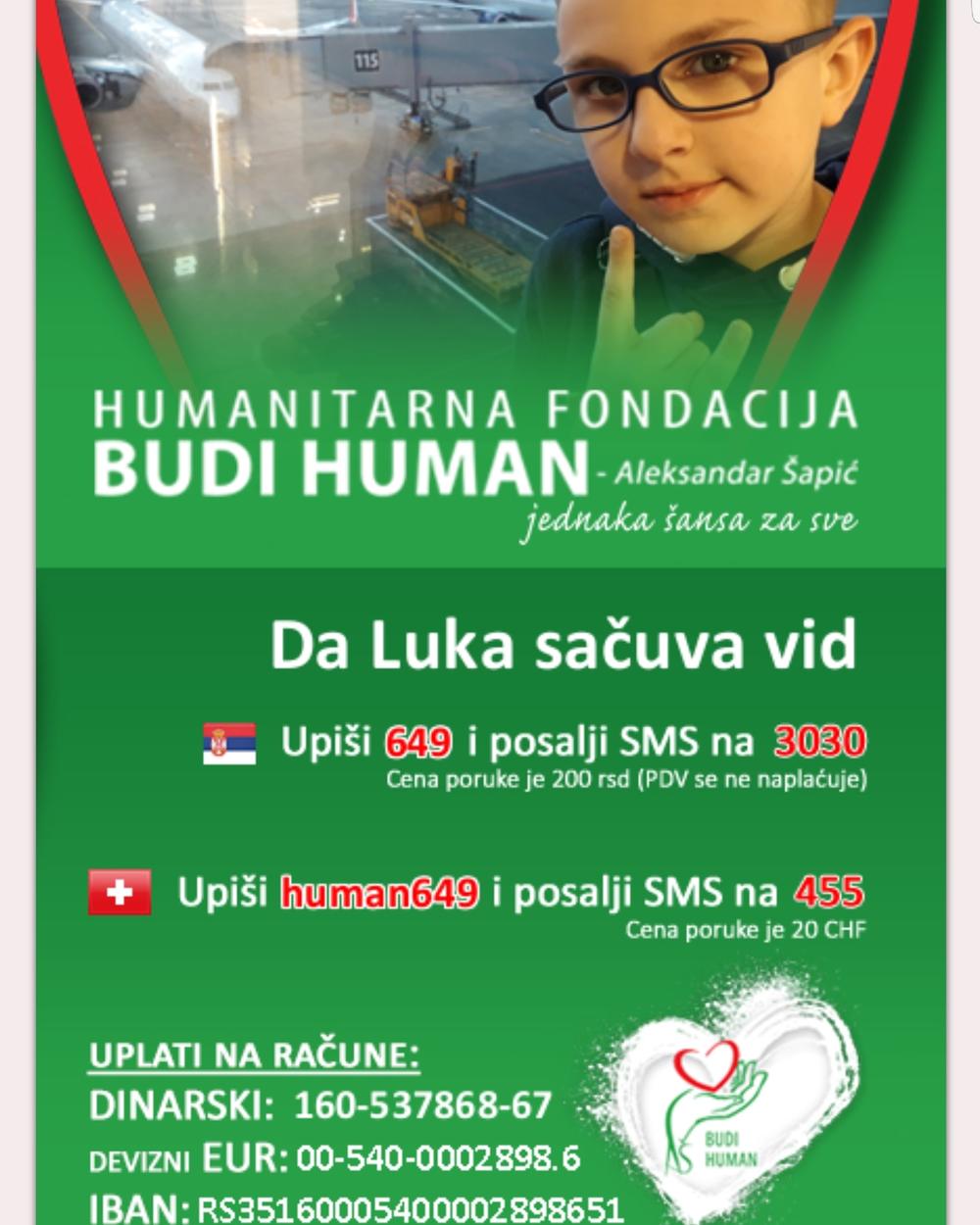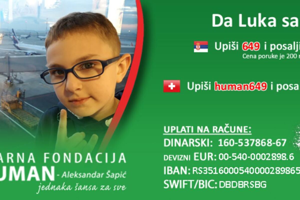 Svako ko bi želeo da pomogne Luki, može to da učini slanjem SMS na 3030 i upisom broja 649. Njemu možemo pomoći i uplatom na dinarski ili devizni račun, kao i putem linka e-doniraj.