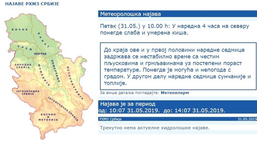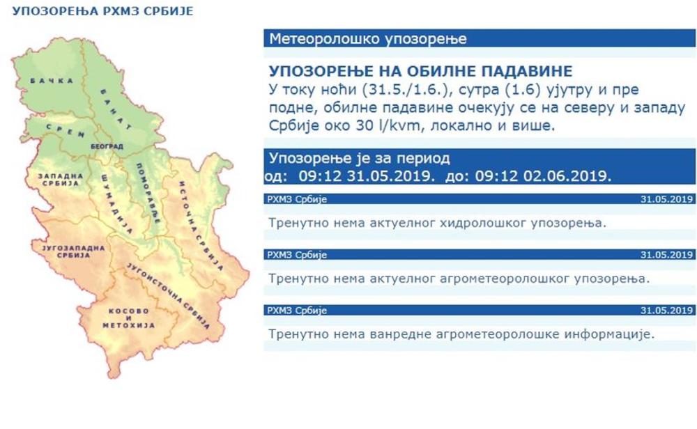 - Obilne padavine očekuju se na severu i zapadu Srbije, pašće oko 30 litara po kvadratnom metru, ponegde i više - stoji u upozorenju RHMZ.