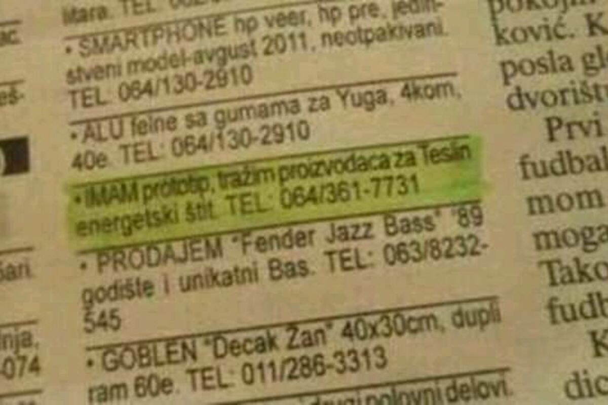 Naime, neko je, uredno dajući svoj broj telefona, napisao sledeće: "Imam prototip, tražim proizvođača za Teslin energetski štit".